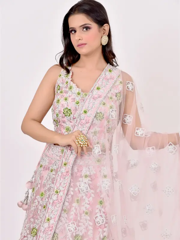 Lehenga Choli :Dori heavy work Lehenga Choli Back NeckPattern: Round Lehenga Choli Color: Light pink Lehenga CholiFabric: Net Lehenga Choli Front Neck Pattern: Round Lehenga Choli Length: 44 inch Lehenga Choli Sleeves: 22 inch